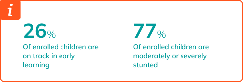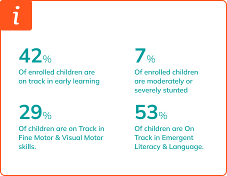 The Index demonstrates that only 42% of enrolled children are On Track in early learning, and children in high-fee preschools are twice as likely to be On Track compared to those in low-fee ones. 7% of enrolled 4-year-olds showed signs of moderate/severe stunting, costing children months of learning.Stunted children are on average 5 months behind their peers in early learning.